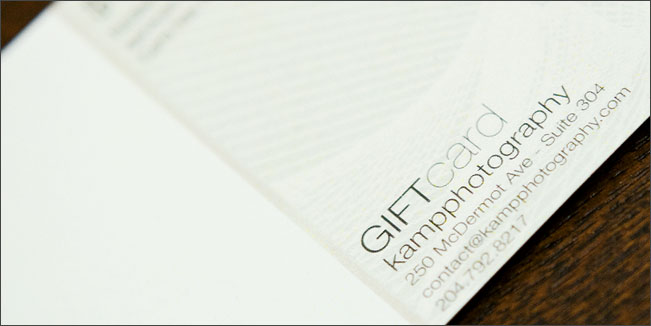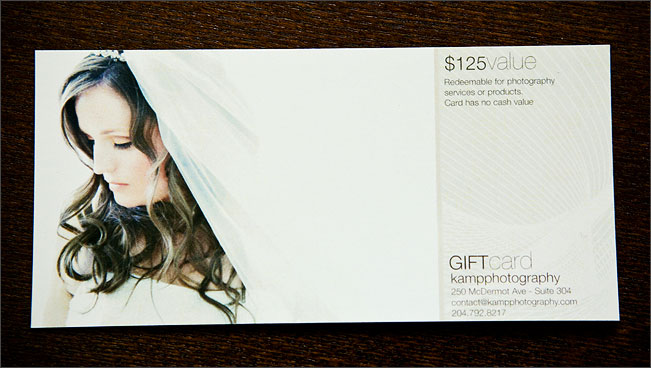 Gift cards are avaliable in any amount you choose, and are redeemable by the holder for photographic services, or photographic products. They are perfect for someone that has hired us for their wedding photography, for friends with new children, parents for their anniversarys, basically anyone. To order a gift card, please contact us at 1.204.792.8217 or
